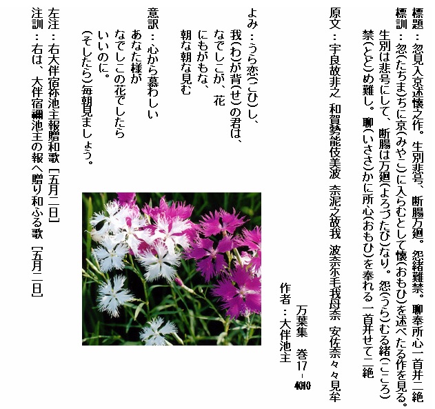 巻17-4010:うら恋し我が背の君はなでしこが花にもがもな朝な朝な見む