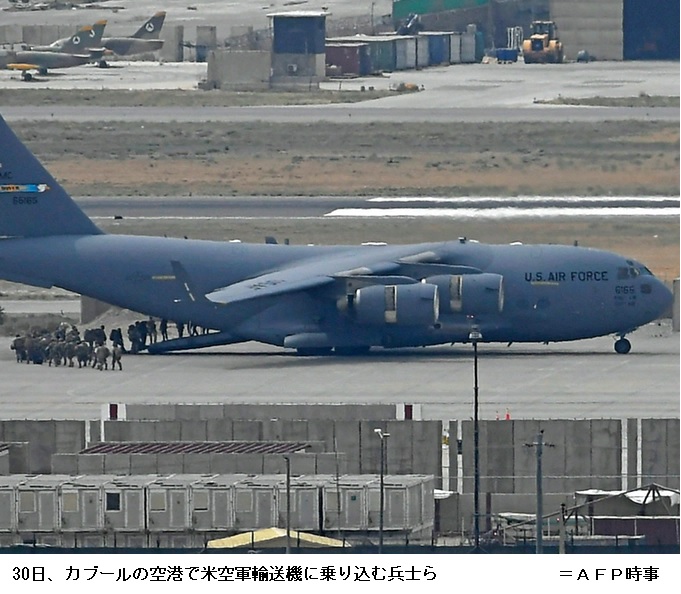 米軍、アフガン撤収完了 米最長の20年戦争終結、米国人ら12万人退避 ―― バイデン米大統領は30日の声明で「20年間にわたる米軍のアフガニスタン駐留が終了した」と明らかにした。掃討をめざしたイスラム主義組織タリバンが復権し、米史上最長の戦争は敗走に近い形で幕を閉じた。国際テロ組織がアフガンを拠点に米国本土を再び攻撃するリスクは消えていない。