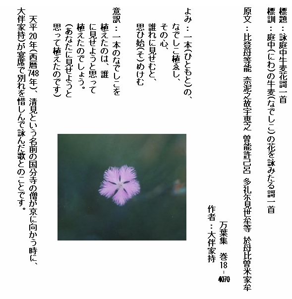 巻18-4070:一本のなでしこ植ゑしその心誰れに見せむと思ひ始めけむ