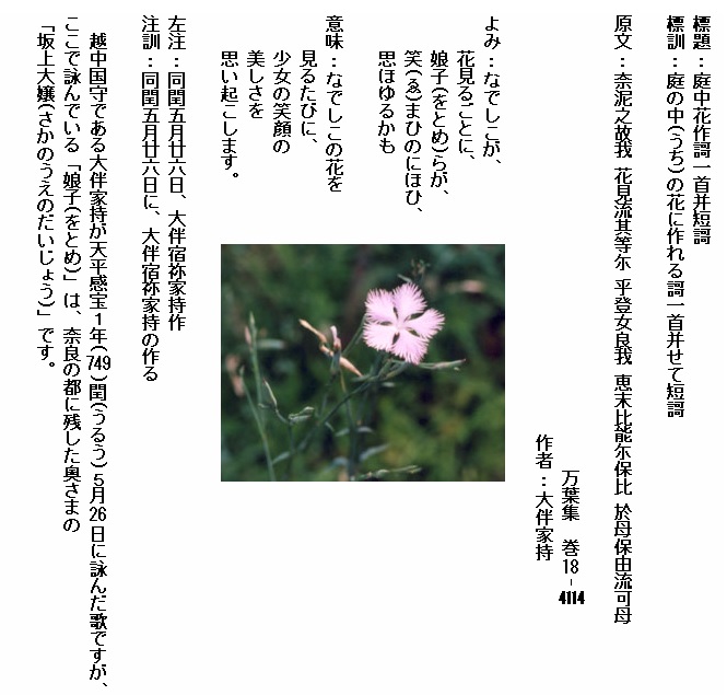 巻18-4114:なでしこが花見るごとに娘子らが笑まひのにほひ思ほゆるかも