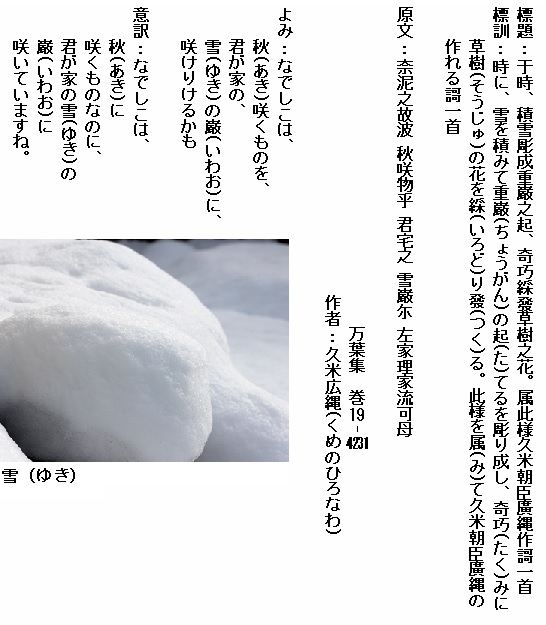 巻19-4231:なでしこは秋咲くものを君が家の雪の巌に咲けりけるかも