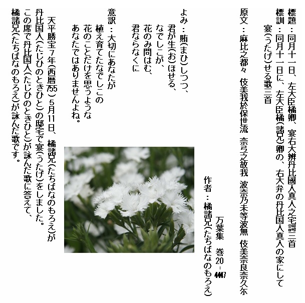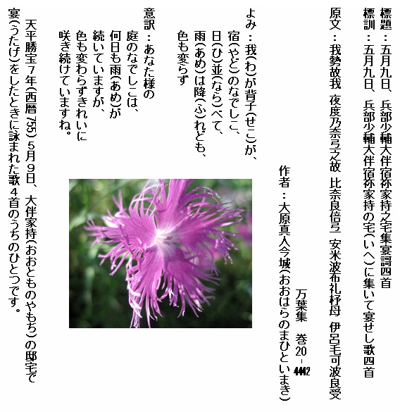 ◎注意 標題の「詠庭中牛麦花謌一首」の「牛麦」は、呉音で「牛」と「瞿」の発音(ゴゥ)が同音のため、漢語でなでしこを示す「瞿麦(クバク)」の異字と云われています。