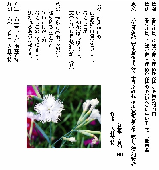 巻20-4443:ひさかたの雨は降りしくなでしこがいや初花に恋しき我が背