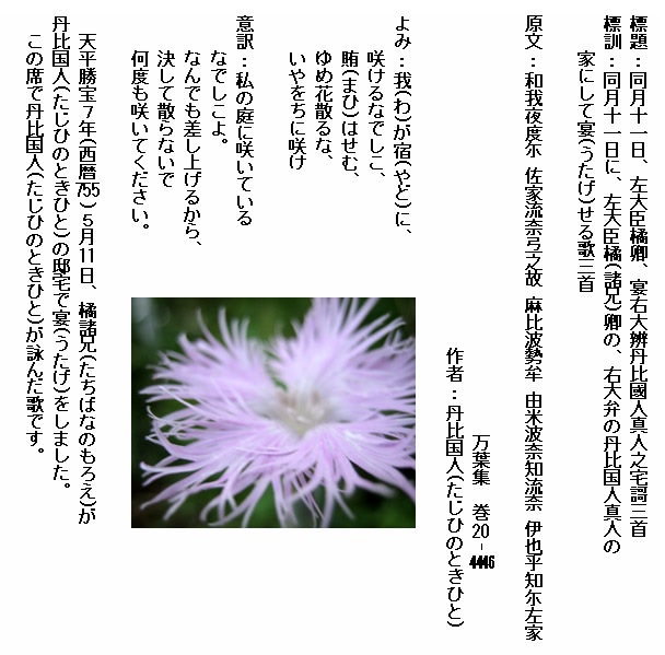 巻20-4446:我が宿に咲けるなでしこ賄はせむゆめ花散るないやをちに咲け