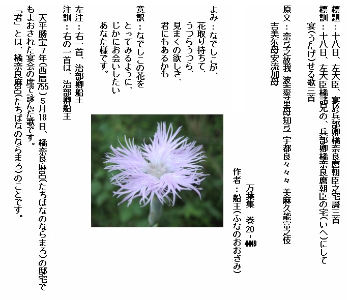 巻20-4449:なでしこが花取り持ちてうつらうつら見まくの欲しき君にもあるかも