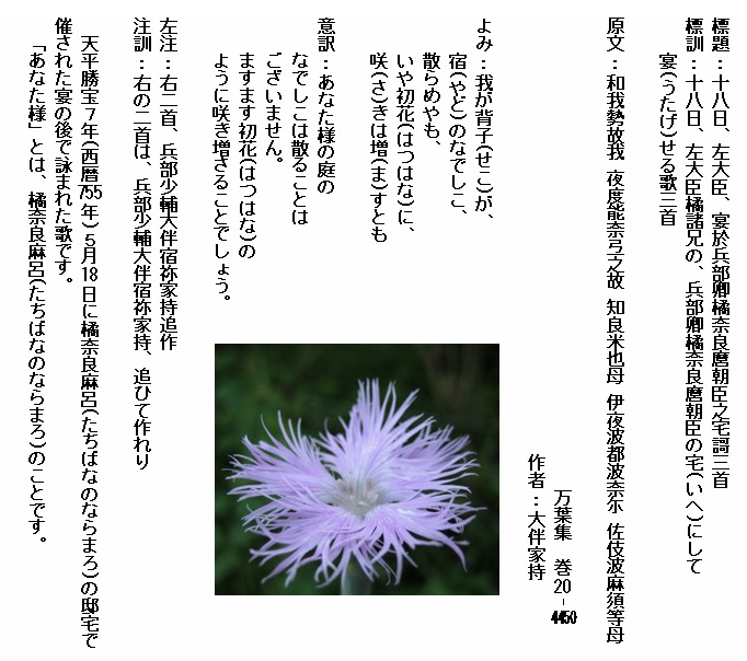 巻20-4450:我が背子が宿のなでしこ散らめやもいや初花に咲きは増すとも