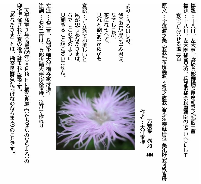 巻20-4451:うるはしみ我が思ふ君はなでしこが花になそへて見れど飽かぬかも
