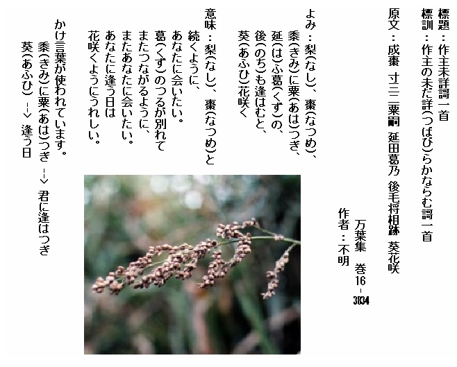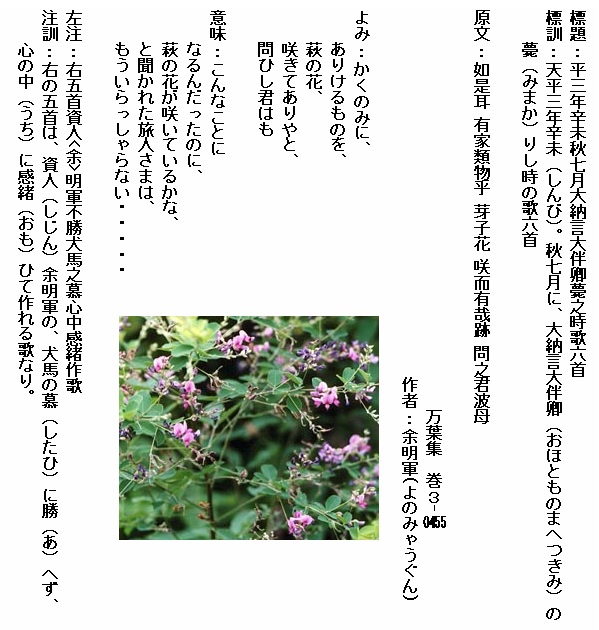 巻3-0455:かくのみにありけるものを萩の花咲きてありやと問ひし君はも