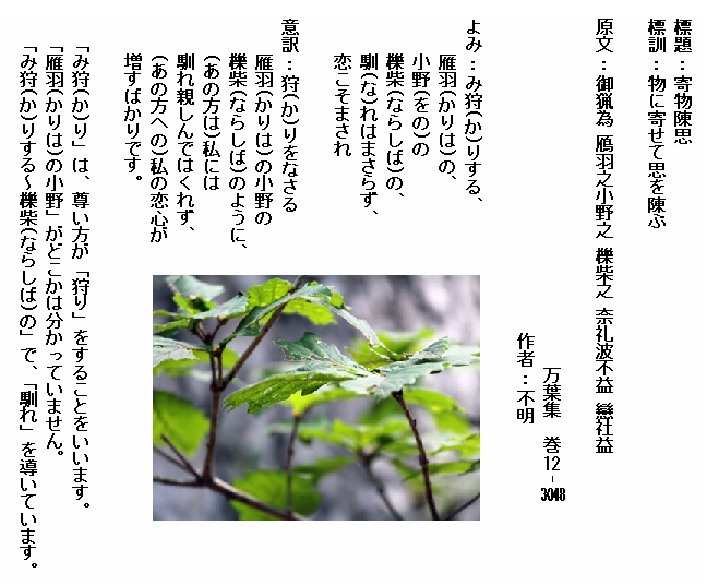 巻12-3048: み狩りする雁羽の小野の櫟柴のなれはまさらず恋こそまされ