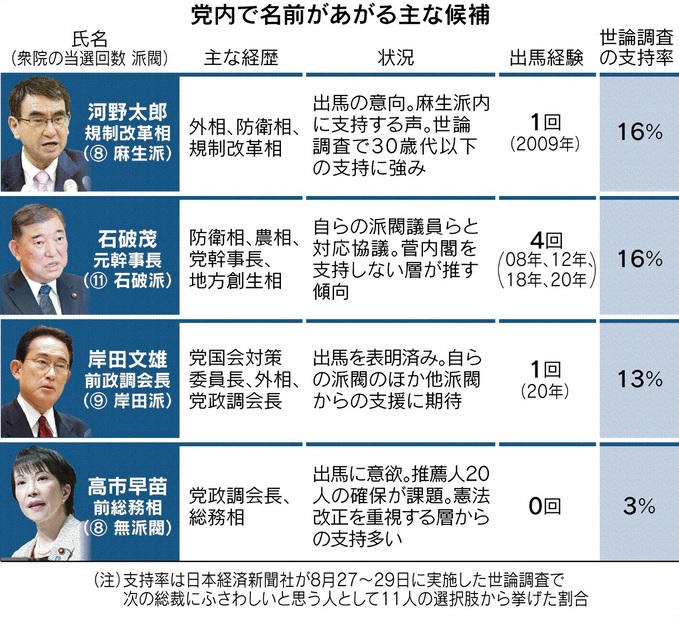 日本経済新聞社が8月27~29日に実施した世論調査で「次の自民党総裁にふさわしい人」のトップは回答者の16%が挙げた河野氏だった。世代別にみると30歳代以下の層では他の候補に10ポイント以上の差がついた。麻生派の当選回数が少ない議員らが出馬を推す。