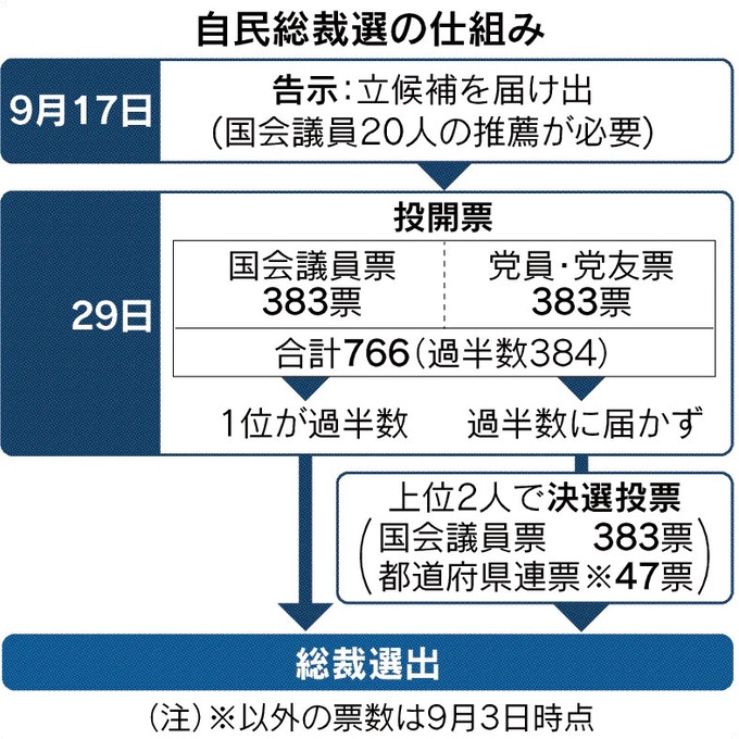 総裁選は首相と岸田氏の争いが軸になるとみられていた。最大派閥である細田派出身の安倍晋三前首相や第2派閥の麻生派を率いる麻生太郎副総理・財務相は首相を支える方向で動いてきた。