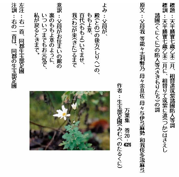 巻20-4326:父母が殿の後方のももよ草百代いでませ我が来るまで