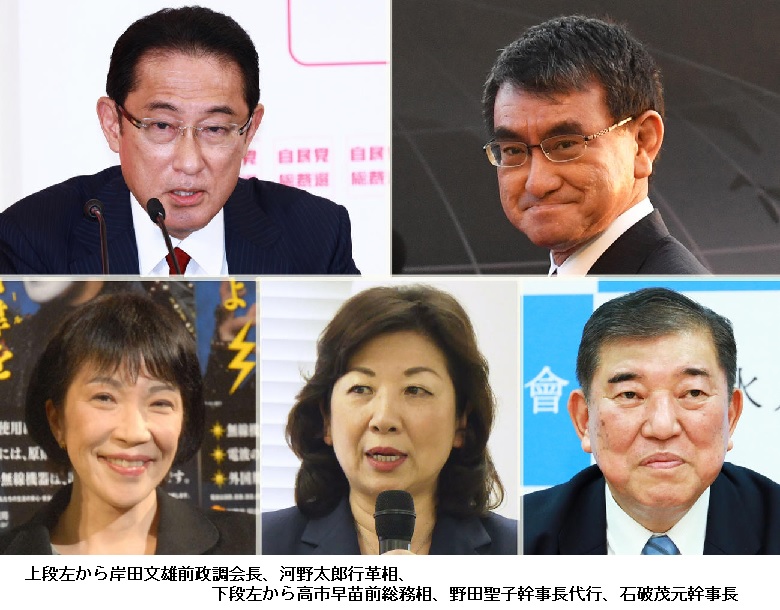 総裁選 構図が一変 立候補の動き活発に 岸田・河野氏出馬、石破氏も検討 17日告示、29日投開票 ―― 自民党総裁選は菅義偉首相の不出馬によって構図が変わった。立候補を表明済みの岸田文雄前政調会長に加えて河野太郎規制改革相が出馬の意向を固めた。石破茂元幹事長は対応を周辺と協議中で、高市早苗前総務相も意欲を示す。17日の告示まで2週間のタイミングで混戦模様となった。