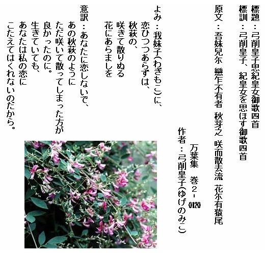巻2-0120:我妹子に恋ひつつあらずは秋萩の咲きて散りぬる花にあらましを