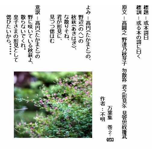 巻2-0233:高円の野辺の秋萩な散りそね君が形見に見つつ偲はむ