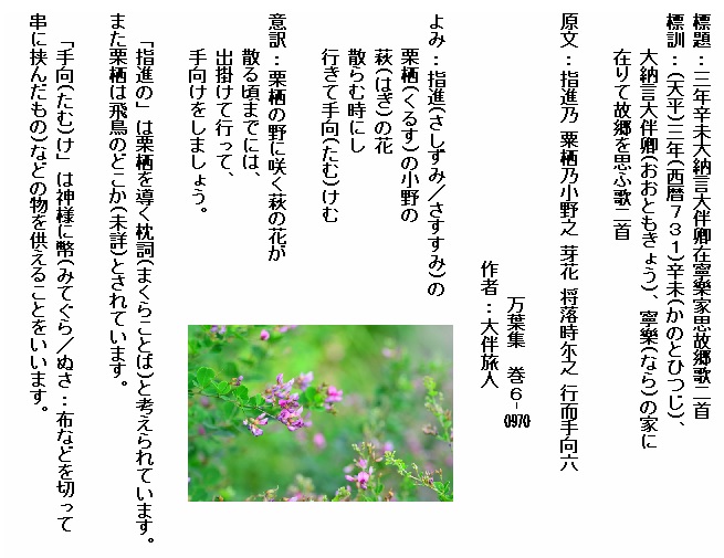 巻6-0970:指進の栗栖の小野の萩の花散らむ時にし行きて手向けむ