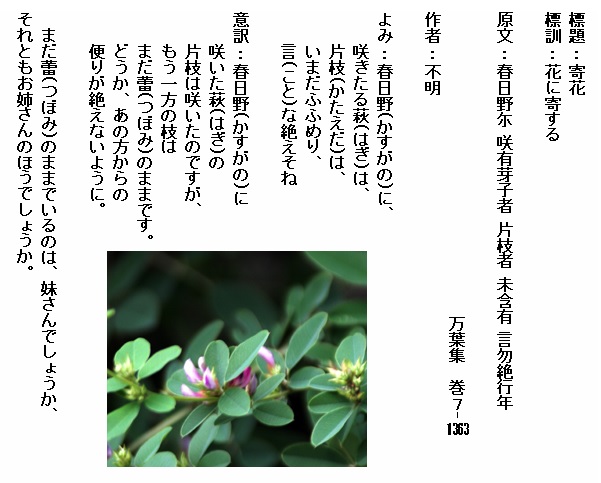 巻7-1363:春日野に咲きたる萩は片枝はいまだふふめり言な絶えそね