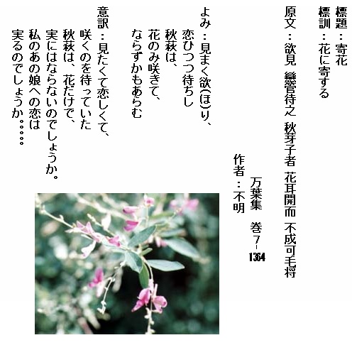 巻7-1364:見まく欲り恋ひつつ待ちし秋萩は花のみ咲きてならずかもあらむ