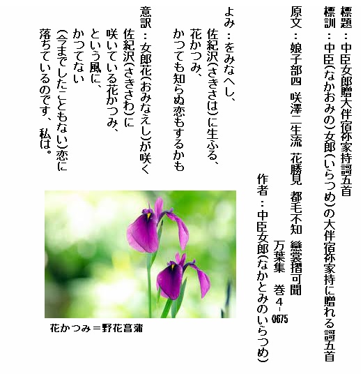 巻4-0675:をみなへし佐紀沢に生ふる花かつみかつても知らぬ恋もするかも