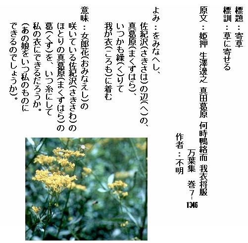 巻7-1346:をみなへし佐紀沢の辺の真葛原いつかも繰りて我が衣に着む