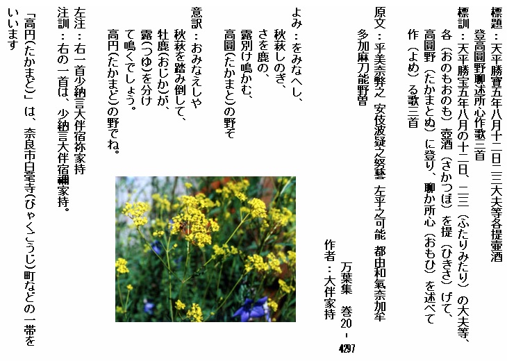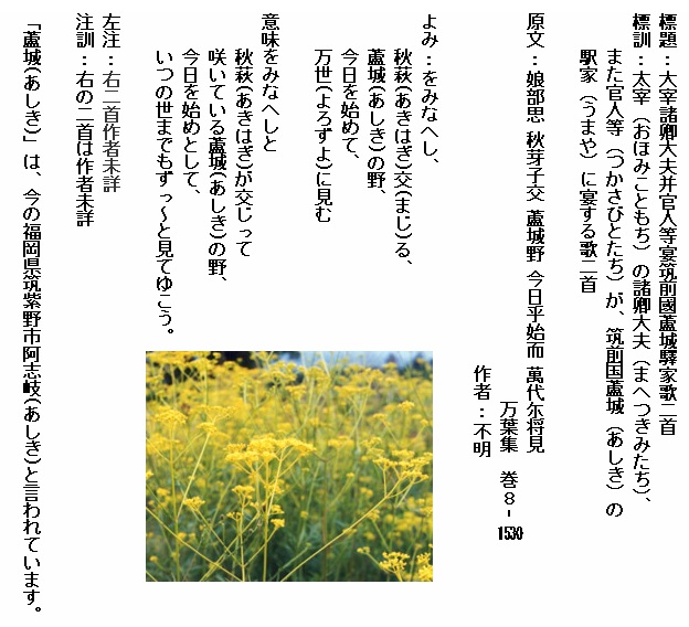 巻8-1530:をみなへし秋萩交る蘆城の野今日を始めて万世に見む
