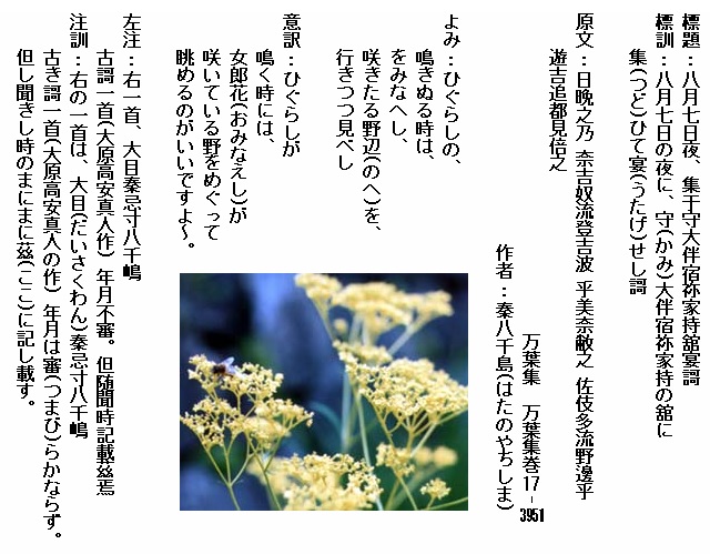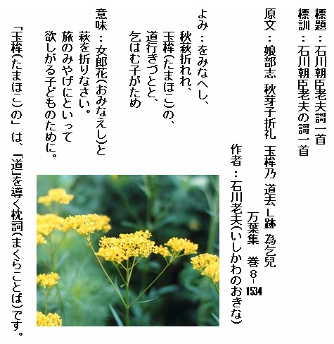 歌の内容は「女郎花も秋萩も手折れ。玉鉾の道行く旅の土産と願うだろうあの児のために」と、秋の草花である女郎花と秋萩を愛しい児への土産にしようと詠んだ一首です。