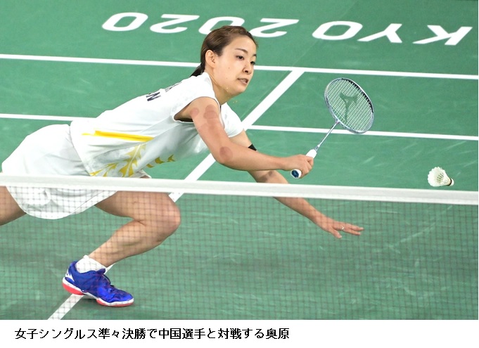 混合ダブルス3位決定戦で渡辺勇大、東野有紗組(日本ユニシス)が鄧俊文、謝影雪組(香港)を2-0で下し、銅メダルを獲得した。この種目での日本勢のメダルは初めて。女子シングルス準々決勝で、2016年リオデジャネイロ大会銅メダルの奥原希望(太陽ホールディングス)は何氷嬌(中国)に1-2で逆転負け、4強入りを逃した。女子シングルス準々決勝で、山口茜(再春館製薬所)がプサルラ(インド)に0-2で敗れた。