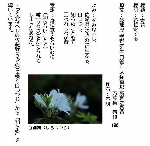 巻10-1905:をみなへし佐紀野に生ふる白つつじ知らぬこともち言はえし我が背