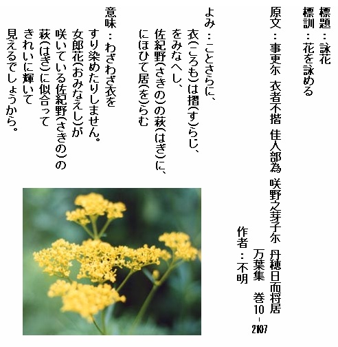 巻10-2107:ことさらに衣は摺らじをみなへし咲く野の萩ににほひて居らむ
