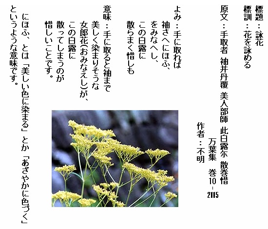 巻10-2115:手に取れば袖さへにほふをみなへしこの白露に散らまく惜しも