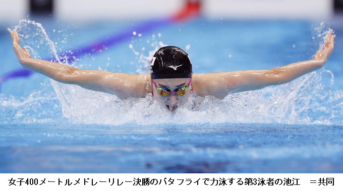 400メートルメドレーリレーの男子で、日本(入江、武良、水沼、中村)が3分29秒91の日本新記録で6位に入った。女子の日本(小西、渡部、池江、五十嵐)は3分58秒12の8位だった。男子は米国が3分26秒78の世界新記録で制し、女子はオーストラリアが勝った。競泳で日本のメダルは金2、銀1で、入賞は9。1988年ソウル五輪以来8大会ぶりに入賞数が1桁にとどまった。