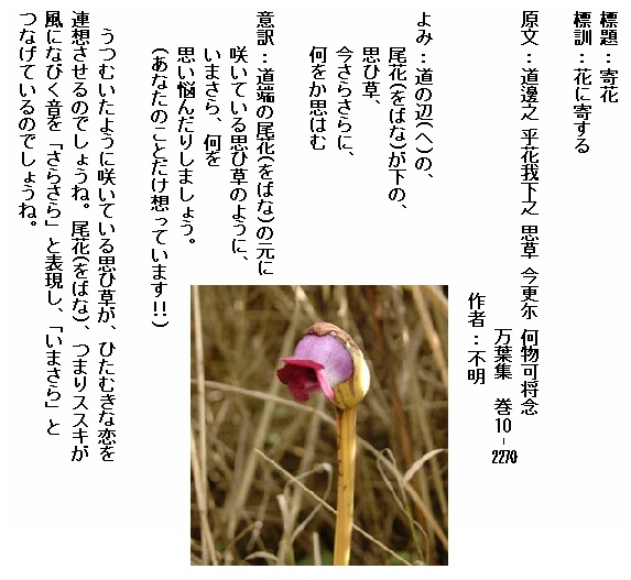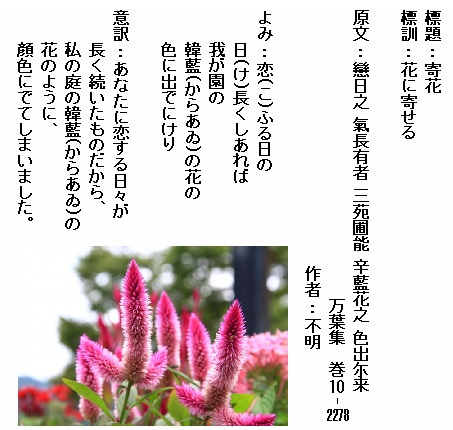 巻10-2278:恋ふる日の日長くしあれば我が園の韓藍の花の色に出でにけり