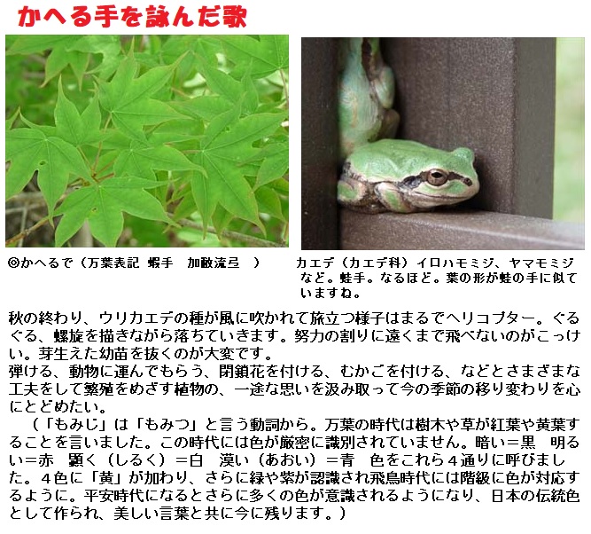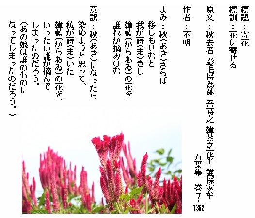 ◎この歌は山部宿禰赤人(やまのべのすくねあかひと)が庭に種を蒔いた鶏頭を詠った一首です。「韓藍(からあゐ)」は「鶏頭(けいとう)」のことで、「韓(から)」の「藍(あゐ)」色を取る草として絵具用に大陸からもたらされた植物です。そんな鶏頭の種を家に蒔いた赤人が「私の家に鶏頭の種を蒔いて育てたけれど枯れてしまったよ。けれども懲りずにまた蒔こうと思います。」と、一度は枯らせてしまったけれど懲りずにまた蒔きたいとの思いを詠った一首となっています。
