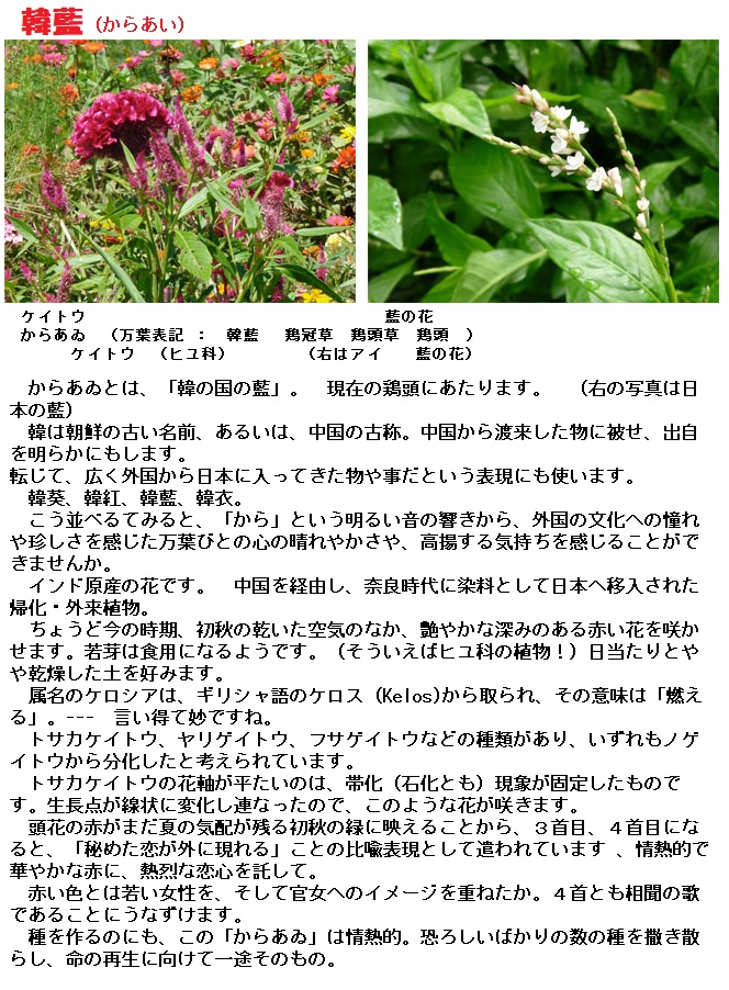 韓藍(からあい)はヒユ科の一年草の鶏頭(けいとう)とされています。熱帯アジアが原産です。鶏頭(けいとう)はその名の通り、鶏のとさかに似た赤い花をつけます。韓藍(からあい)は、韓(から:古代の朝鮮、中国)から来た藍(あい)からその名がつけられたと考えられています。ちなみに、藍(あい)には赤い花のものもありますね。