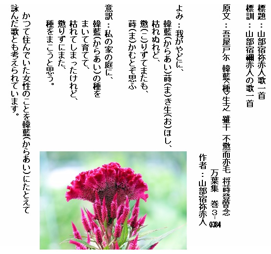 ただ、この歌はどうやら実際に鶏頭の種を蒔いたわけではなく「韓藍(鶏頭)」をお題にして詠まれた宴席歌のようで、この「韓藍」には女性のことを譬えて詠っているようです。つまりは、「私の家で美しい女性を住まわせていたのですがその人は去ってしまいました。けれども懲りずにまた素敵な女性を探そうと思います」といった感じでしょうか。まあ、赤人にそのような想い人が実際にいたわけではないのでしょうけれど、宴席での戯れ歌としては魅力的な恋歌ですよね。