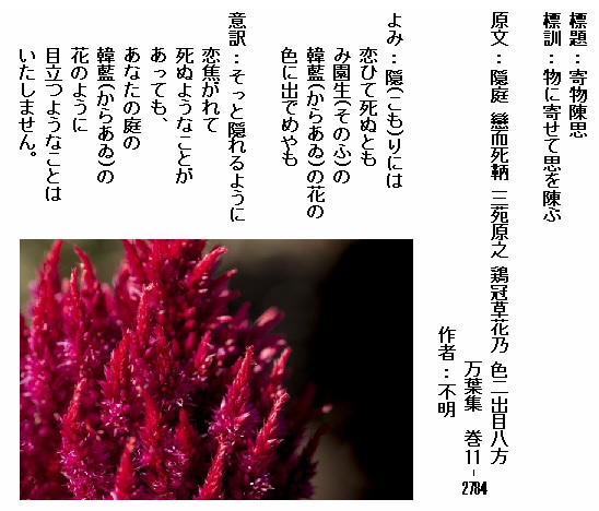 巻11-2784:隠りには恋ひて死ぬともみ園生の韓藍の花の色に出でめやも