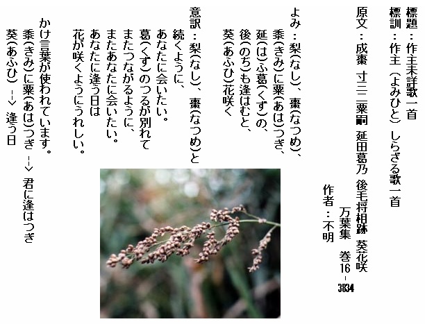 巻16-3834:梨棗黍に粟つぎ延ふ葛の後も逢はむと葵花咲く