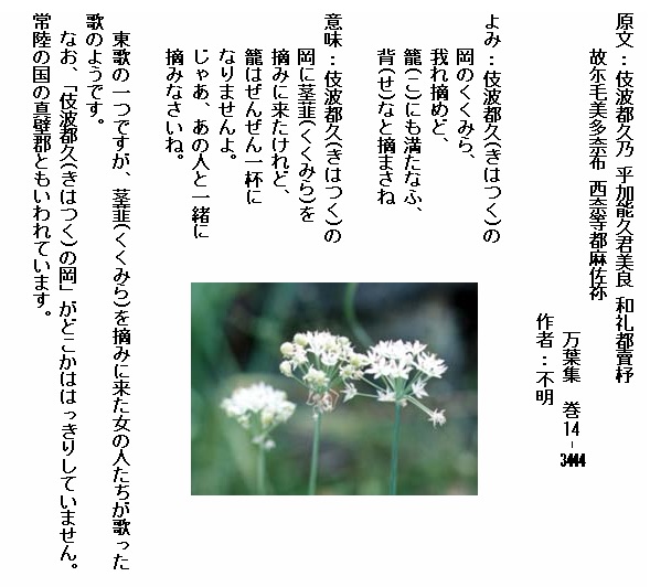 万葉集には一首だけに登場します。東歌のひとつで、茎韮(くくみら)を摘みにきた女性たちの歌といわれています。