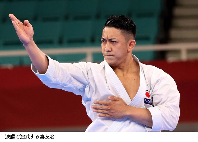 五輪初実施の空手男子形決勝で喜友名諒(劉衛流龍鳳会)がキンテロ(スペイン)を破り、金メダルを獲得した。