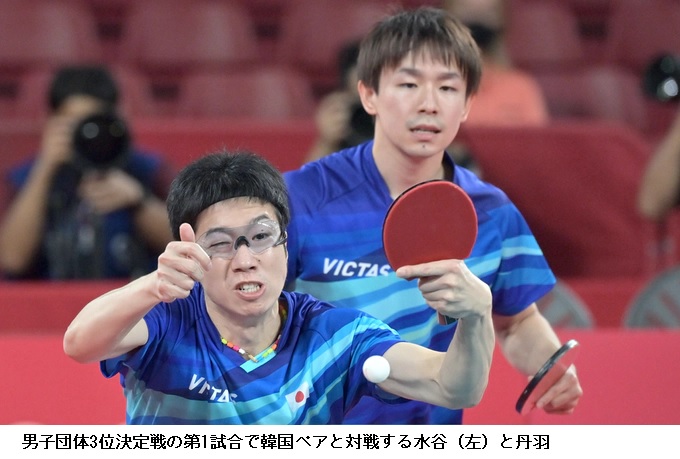 男子団体の3位決定戦で前回リオデジャネイロ五輪銀メダルの日本は韓国を3-1で下し、銅メダルを獲得した。第1試合のダブルスで丹羽孝希(スヴェンソンホールディングス)水谷隼(木下グループ)組が3-1で先勝すると、シングルスでも張本智和(木下グループ)、水谷が勝利した。