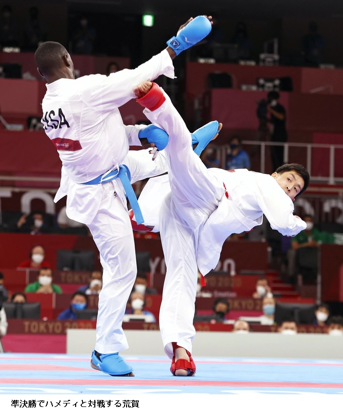 男子組手75キロ超級の荒賀龍太郎(荒賀道場)は準決勝でタレグ・ハメディ(サウジアラビア)に敗れ、銅メダルとなった。