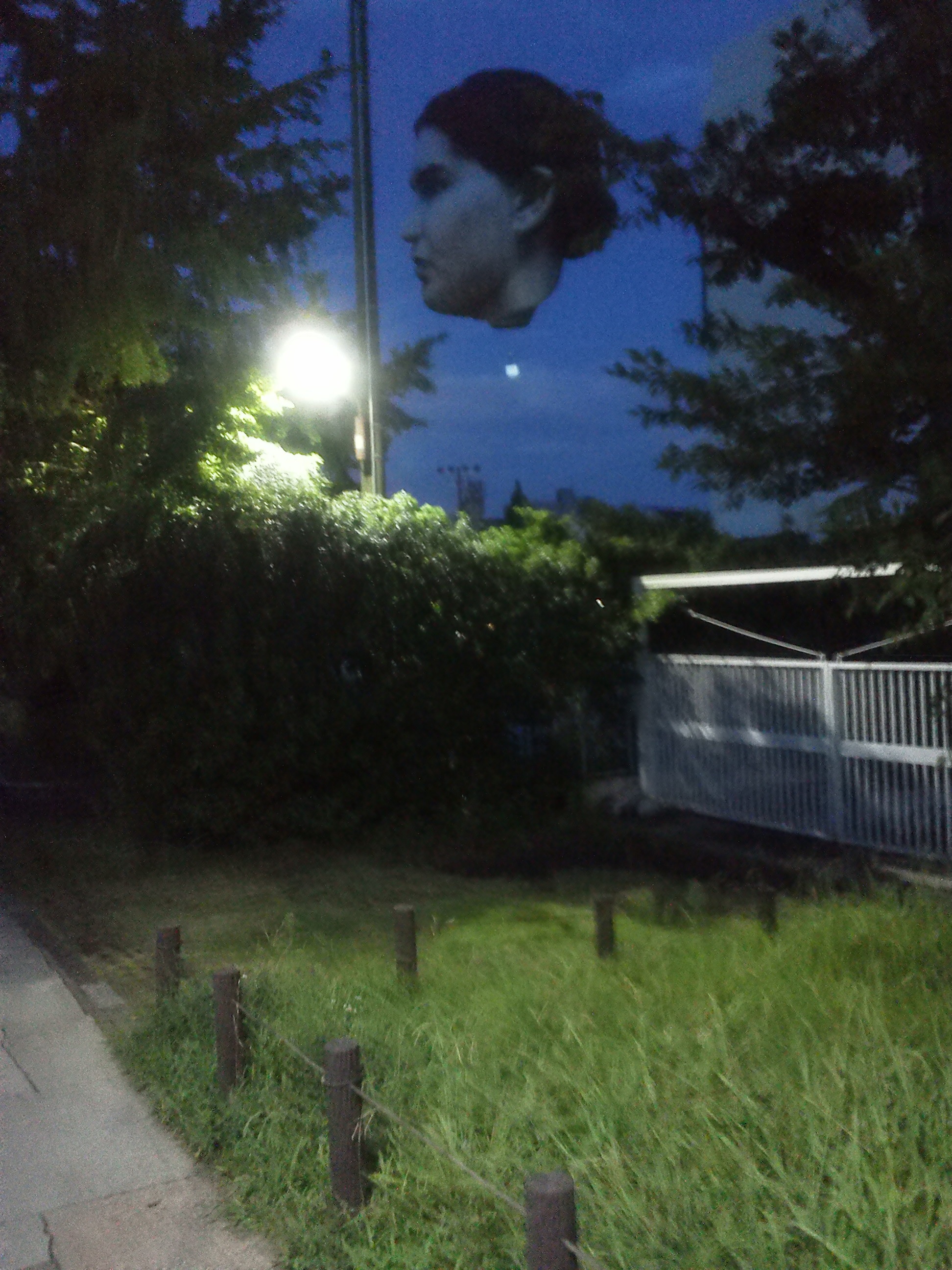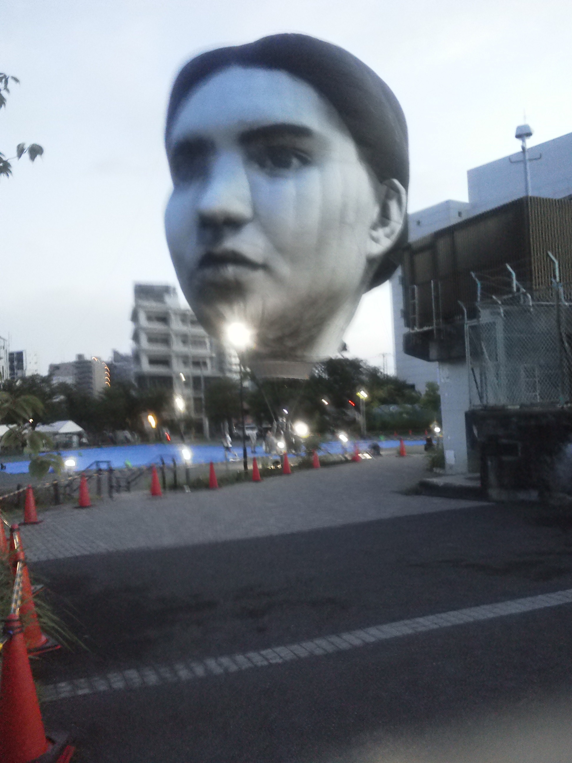 何時ものように朝の散歩で出かけましたが、山谷堀広場の上空に何やら異様な物体があるので、少々驚きました。いやはや、何の催しかは存じませんが、よく見ると女性らしき頭の巨大バルーンのようです。震える手で、2枚ほど写真を携帯に収めました。