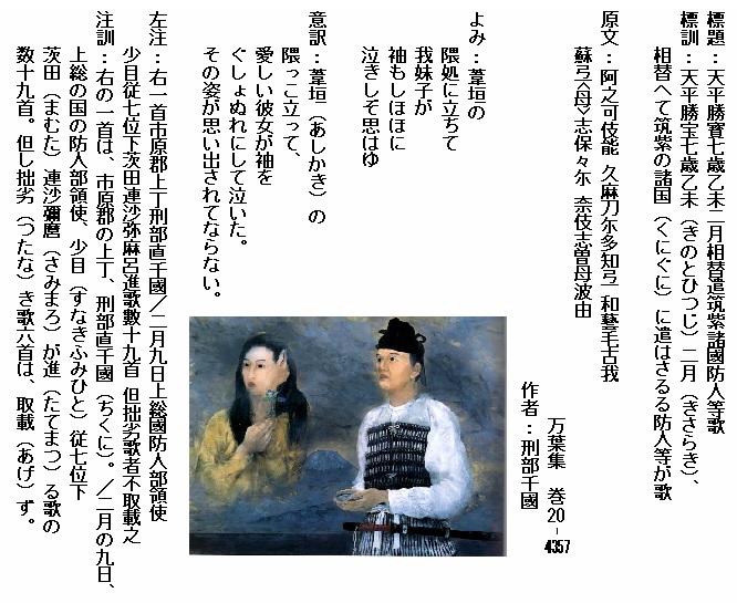 巻20-4357:葦垣の隈処に立ちて我妹子が袖もしほほに泣きしぞ思はゆ