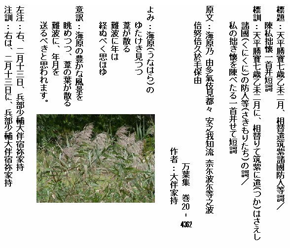 巻20-4362:海原のゆたけき見つつ葦が散る難波に年は経ぬべく思ほゆ