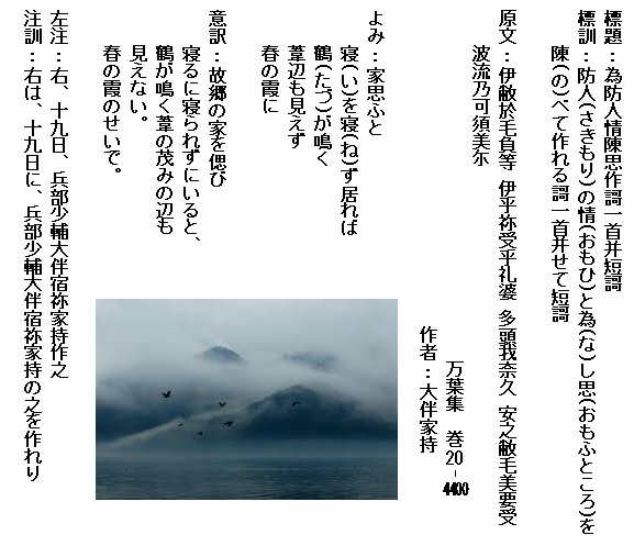 巻20-4400:家思ふと寐を寝ず居れば鶴が鳴く葦辺も見えず春の霞に