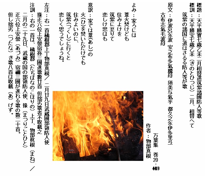 巻20-4419:家ろには葦火焚けども住みよけを筑紫に至りて恋しけ思はも