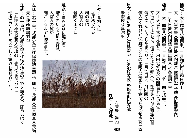 巻20-4459:葦刈りに堀江漕ぐなる楫の音は大宮人の皆聞くまでに