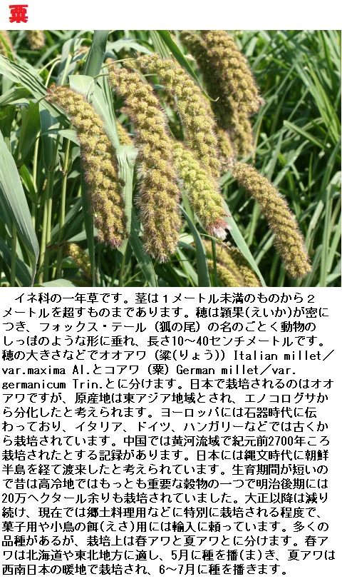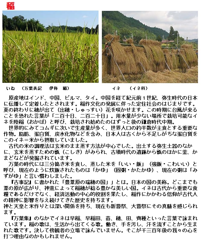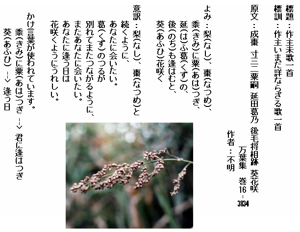巻16-3834: 梨棗黍に粟つぎ延ふ葛の後も逢はむと葵花咲く