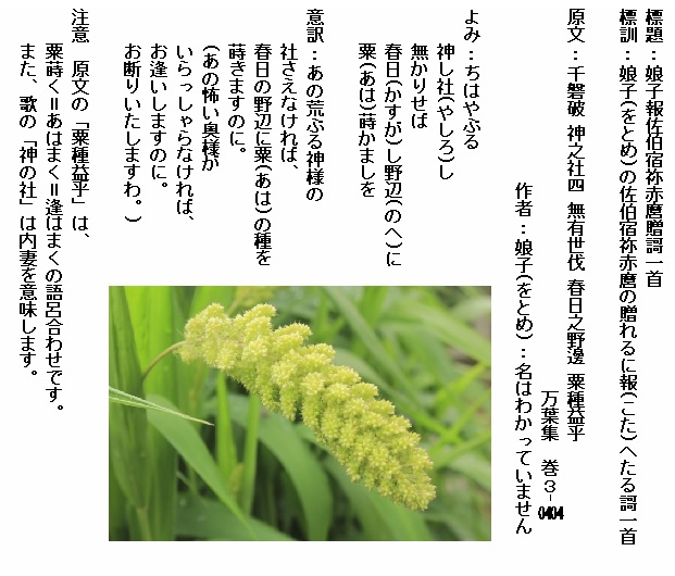 巻3-0404: ちはやぶる神の社しなかりせば春日の野辺に粟蒔かましを