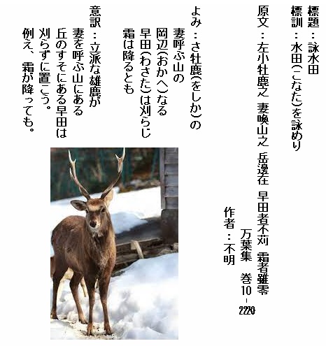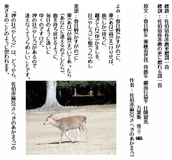 巻3-0405: 春日野に粟蒔けりせば鹿待ちに継ぎて行かましを社し恨めし